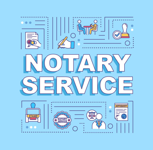 Notary service word concepts banner. Common law. Legal papers. Testament in court. Infographics with linear icons on blue background. Isolated typography. Vector outline RGB color illustration